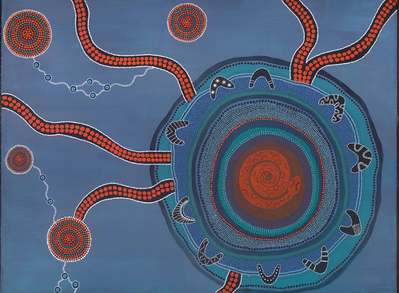 This artwork was commissioned in 2017 by HETI's Medical Portfolio to reflect the unique identity of the Aboriginal Trainee Doctors’ Forum. The artist, Dr Rebecca Davison, is a member of the Forum and a 2017 intern at St Vincent’s Hospital, Sydney. Rebecca is a Kurnai, Dharawal and Dunghutti woman and a passionate and prolific artist who has been painting since high school.
