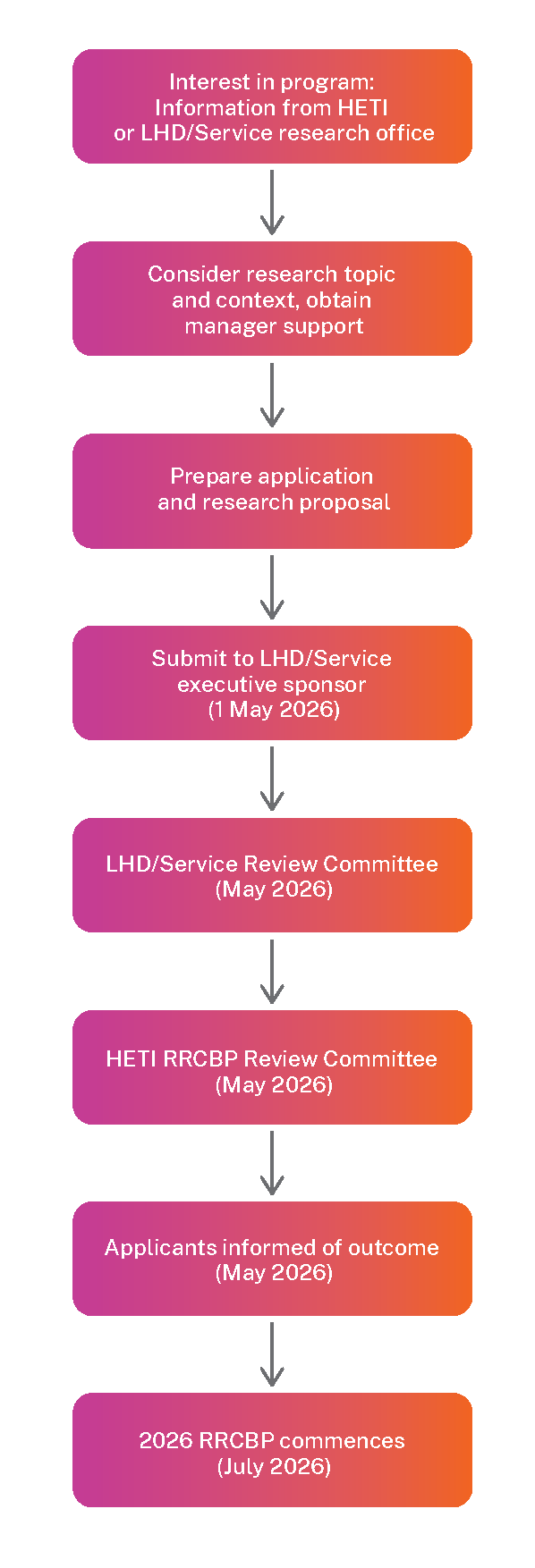 Staff from all rural Local Health Districts in NSW, along with rurally based staff from Ambulance NSW, Justice Health and Forensic Mental Health and NSW Health Pillars are eligible to apply to the program. Individuals are awarded a place in the program based on their readiness to undertake a research project, the relevance of the research to advancing rural health and support from their health service.